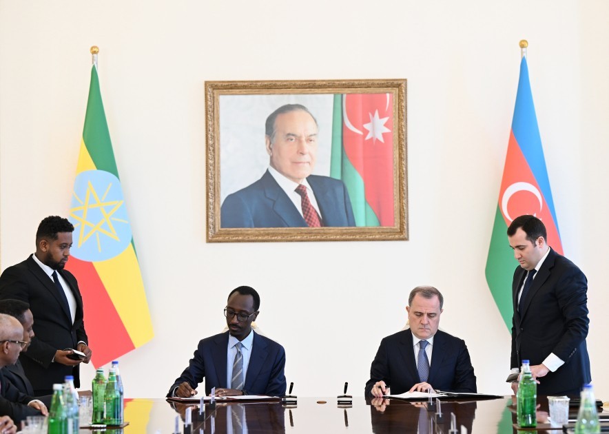 Как передает Vesti.az, по итогам переговоров в присутствии глав государств министр иностранных дел Азербайджана Джейхун Байрамов и министр иностранных дел Эфиопии Гедион Тимотеос подписали «Соглашение о сотрудничестве в области обороны между Правительством Азербайджанской Республики и Правительством Федеративной Демократической Республики Эфиопия», а также «Меморандум о взаимопонимании по сотрудничеству в организации тридцать второй сессии Конференции ООН по изменению климата (COP32)».