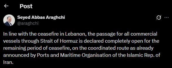 По его словам, в соответствии с договоренностями, достигнутыми на фоне перемирия в Ливане, движение через пролив полностью открыто для всех торговых судов.